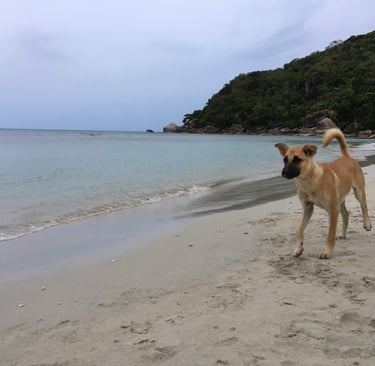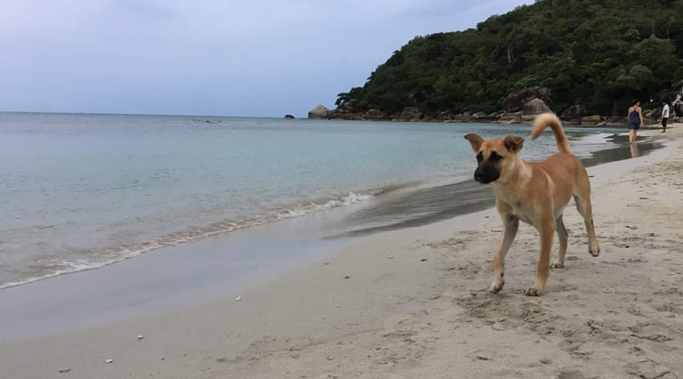 In the summer of 2023, my family went to Ko Samui in Thailand and spent the day at Silver Beach. While we were hanging out, we saw a really cute dog walking around the beach. It looked super hungry, so we gave it some of our food. This dog was extremely cute, playful, and friendly!